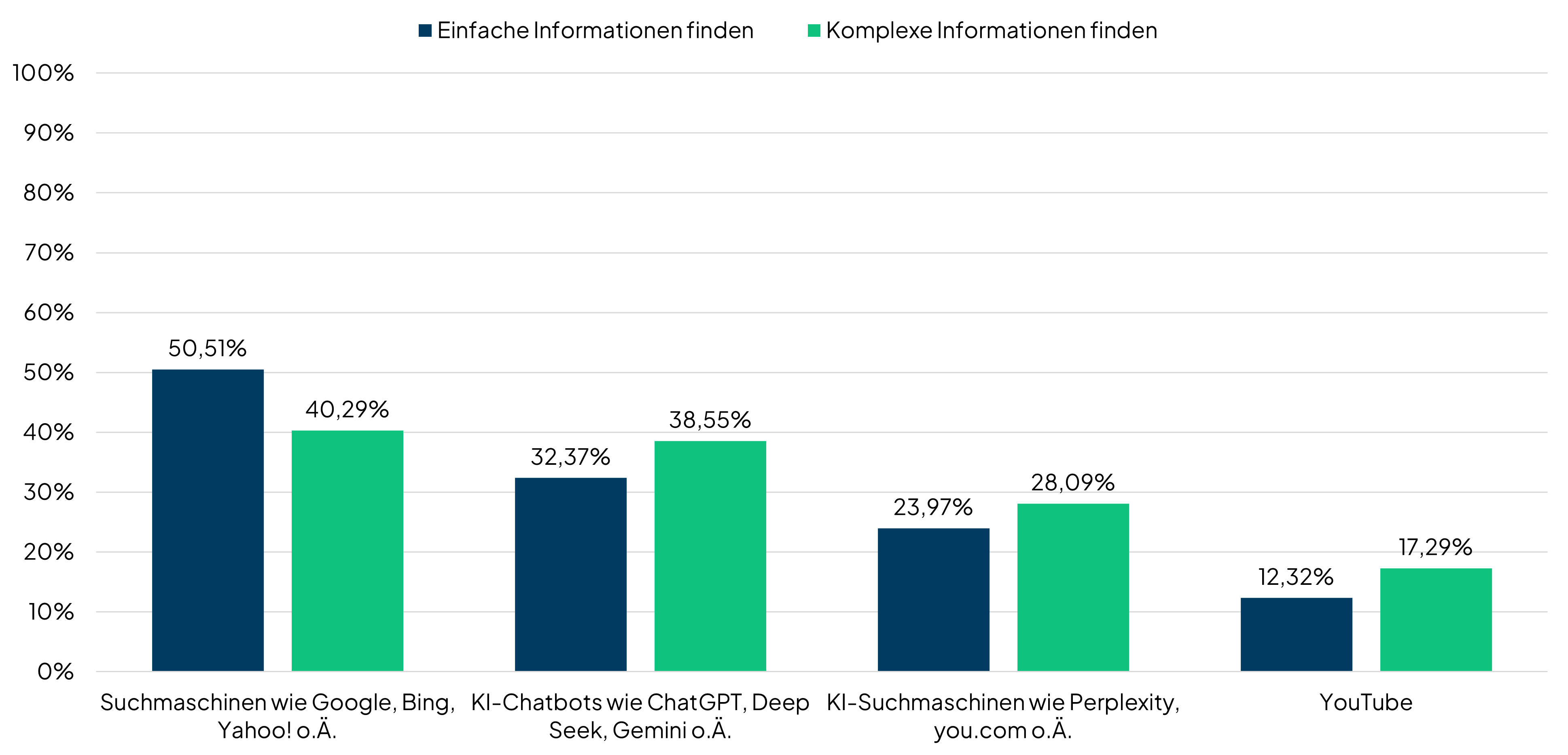 Bei der Informationssuche bleibt Google mit 67 % die erste Anlaufstelle, doch KI-Chatbots sind die großen Gewinner – ihr Anteil stieg von 13 % (2024) auf 21 % (2025). Besonders bei komplexen Informationen holen KI-Lösungen auf: Während Google hier bei 40,29 % liegt, erreichen KI-Chatbots bereits 38,55 % und KI-Suchmaschinen 28,09 %. Bei einfachen Informationen dominiert Google weiterhin (50,51 %).