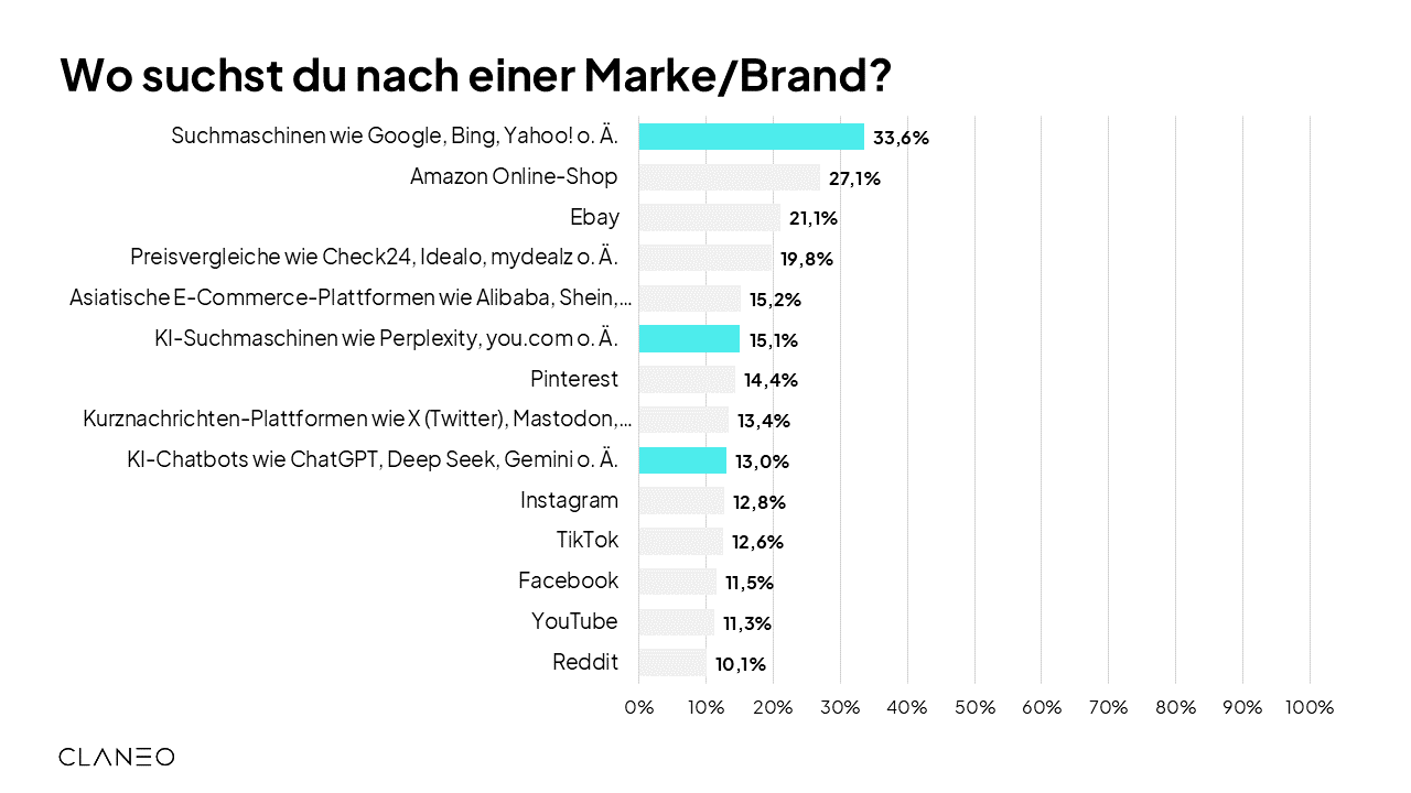 Suchmaschinen (34 %) und Amazon (27 %) sind erste Anlaufstellen bei der Suche nach bestimmten Marken. KI-Plattformen spielen mit 13–15 % eine zunehmende, aber noch untergeordnete Rolle.