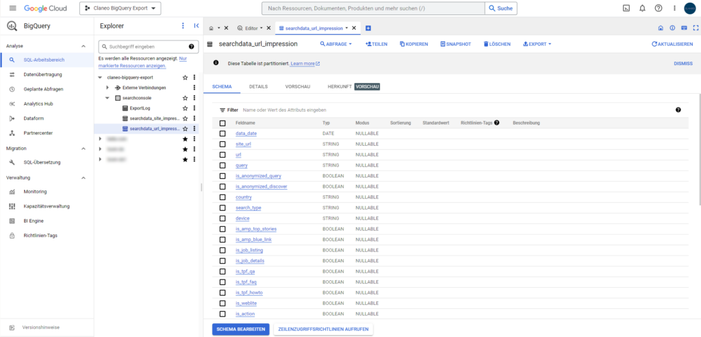 Nach erfolgreicher Einrichtung von BigQuery solltet ihr dort etwa 1-2 Tage später einen täglichen Export eurer Search Console Daten finden. Diese werden in zwei verschiedenen Tabellen dargestellt, unterteilt in URL-Daten und Keyword-Daten.