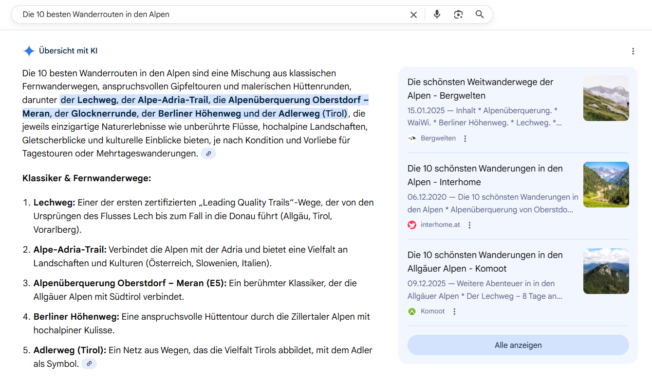 Abb. 2: KI-Systeme wie hier Googles „Übersicht mit KI“ greifen gerne auf Top-10-Listen zurück, und auch fürs Chunking eignen sich Listen gut. Rechts siehst du außerdem die direkten Citations, die der Prompt „Die 10 besten Wanderrouten in den Alpen“ generiert hat.