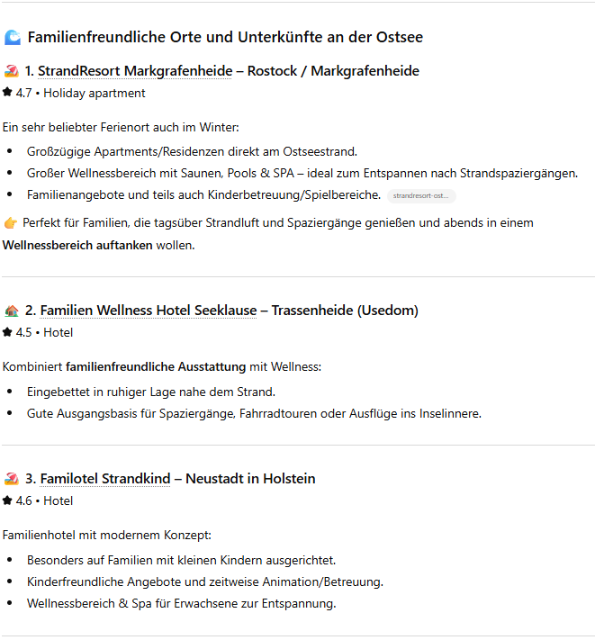 Jeder Chunk beantwortet eine spezifische Frage vollständig. Die Frage stellt jeweils die Überschrift dar, darunter folgt die Antwort. Die Struktur ist perfekt für KI-Systeme, da die meisten Nutzenden ihre Prompts in Form von natürlichen Fragen formulieren. Statt wie früher einfach „Reisetipps Winter Ostsee“ in den Suchschlitz der Suchmaschine einzugeben, stellen wir heute auf KI-Plattformen oft eine komplette Frage und geben Kontext mit, etwa: „Wo könnte man als Familie (2 Erwachsene und 2 Kinder im Alter von 4 und 6 Jahren) im Winter gut Urlaub an der Ostsee machen? Bitte schlage Ziele vor, die familientauglich sind, aber wo es auch Wellnessangebote für Erwachsene gibt.“ In Abbildung 3 siehst du, wie ChatGPT diese Frage beantwortet.
