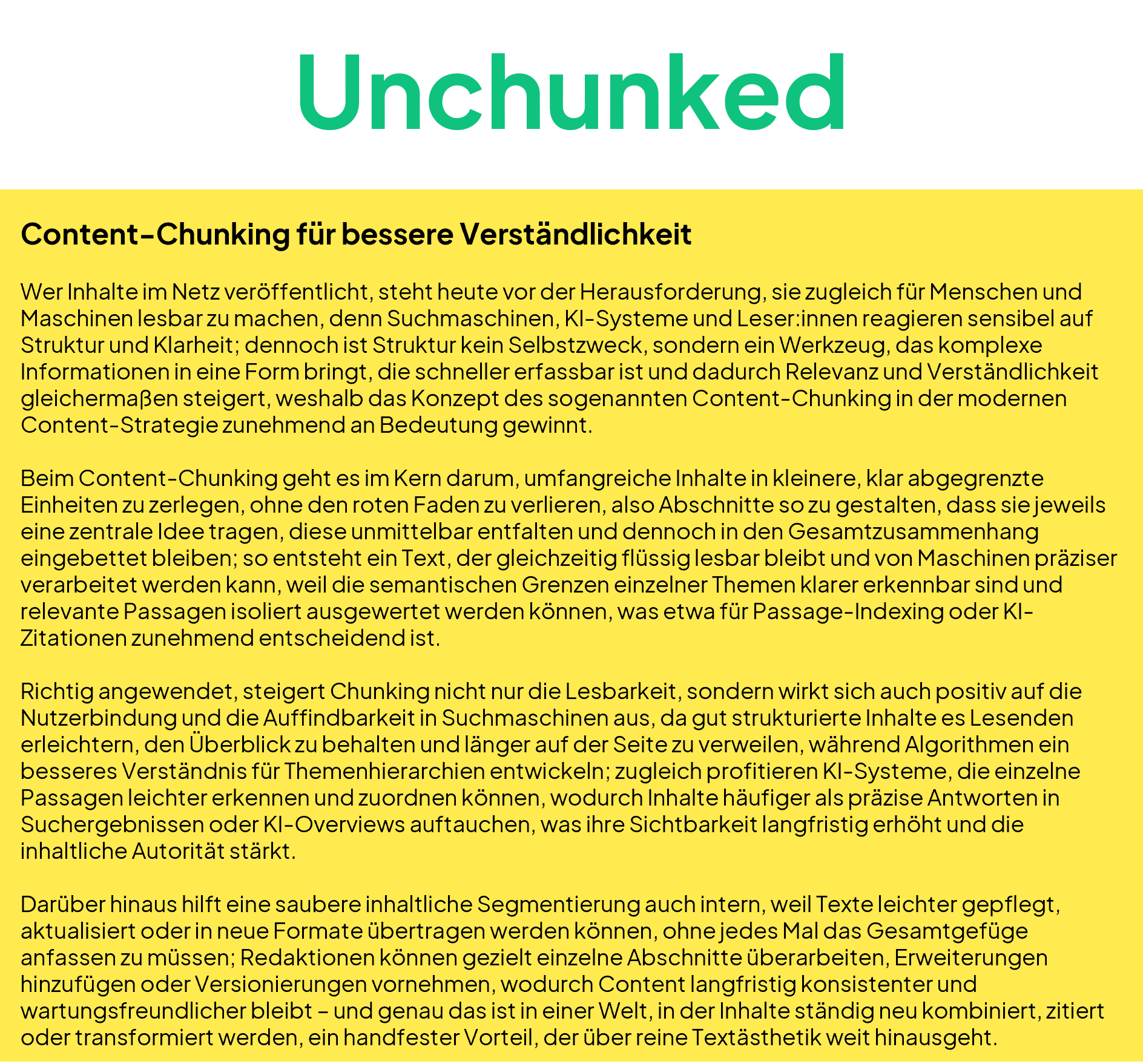 - Standalone-Prinzip: Jeder Chunk sollte ohne andere Textpassagen vollständig verständlich sein.