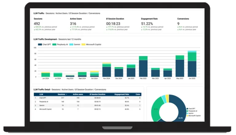 Beispiel-Argumentation: „LLM-Traffic ist in den letzten 6 Monaten um 450 % gewachsen, hat eine Engagement Rate von über 90 % und generiert bereits 2,4 % unserer Conversions, obwohl er nur 1,8 % des Gesamt-Traffic ausmacht. Die Investition in GEO zahlt sich messbar aus.“