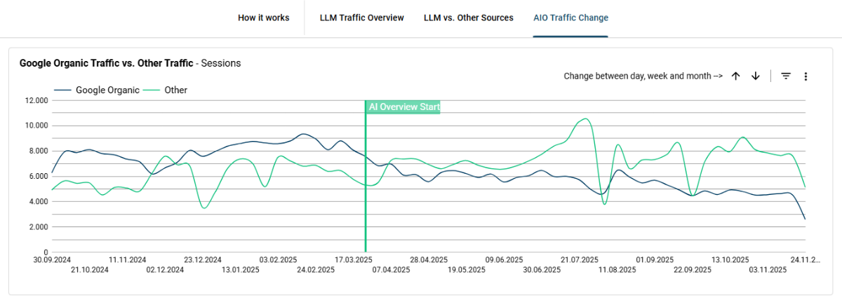 AI Overview Monitoring: Ein dedizierter Bereich zeigt dir, ob dein Traffic aus Google Organic seit dem AI-Overview-Launch am 26. März 2025 zurückgegangen ist.