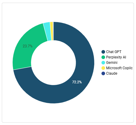 ChatGPT dominiert mit 72 % des gesamten KI-Chatbot-Traffic. Perplexity folgt mit 24 %, während Gemini, Microsoft Copilot und Claude zusammen nur 4 % ausmachen.