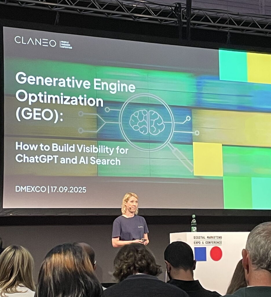 Das absolute Highlight unseres DMEXCO-Auftritts war die Masterclass „Generative Engine Optimization (GEO): How to Build Visibility for ChatGPT and AI Search“, geleitet von unserer Senior SEO Consultant Nadine McNulty. Am 17. September 2025 von 13:00 bis 13:30 Uhr teilte Nadine ihre tiefe Expertise zu einem der wichtigsten Zukunftsthemen der Branche.
