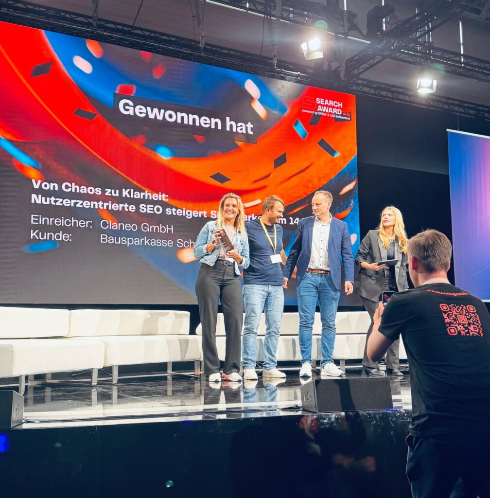 Ein besonderer Höhepunkt der DMEXCO 2025 war die Auszeichnung von Claneo durch den BVDW in der Kategorie „Beste B2C SEO-Strategie & Umsetzung“. Unser preisgekrönter Case „Von Chaos zu Klarheit: Nutzerzentrierte SEO steigert Sichtbarkeit um 144 %“ mit der Bausparkasse Schwäbisch Hall wurde von der Jury für seine nachhaltige und langfristige Strategie gewürdigt.