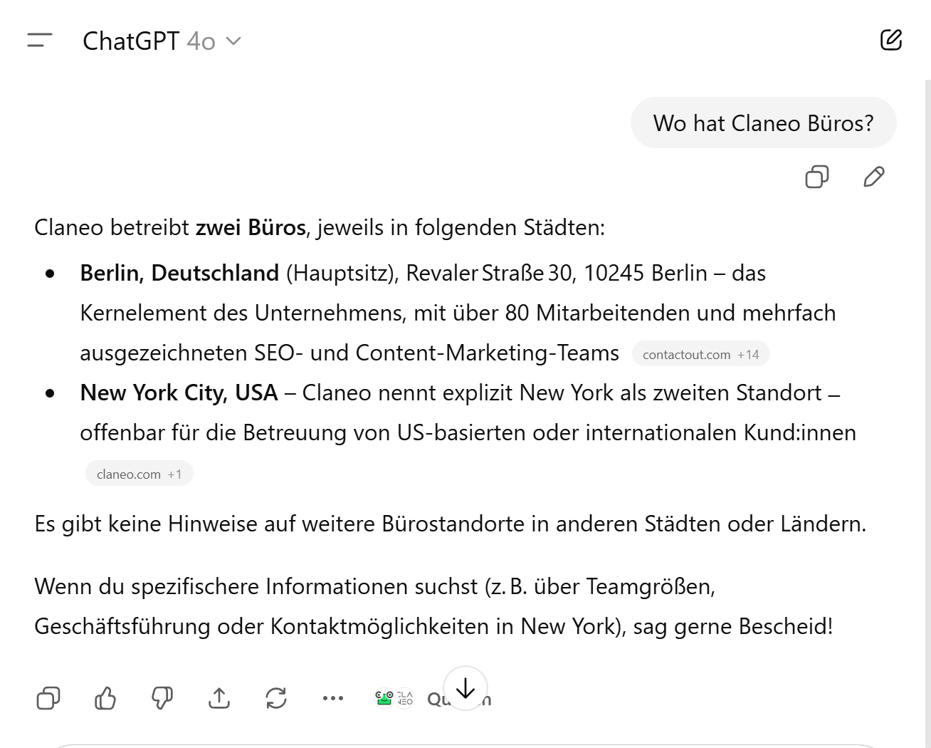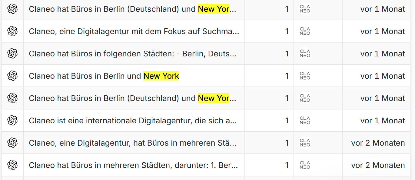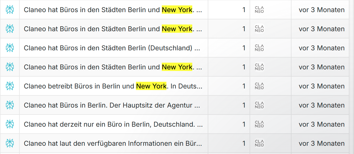 Unser erster Test bezog sich auf Brand-Prompts. Die Frage: Wie schnell werden ChatGPT und Co. Claneo einen Standort in New York zusprechen, nur weil diese Information auf unserer Domain genannt wird?