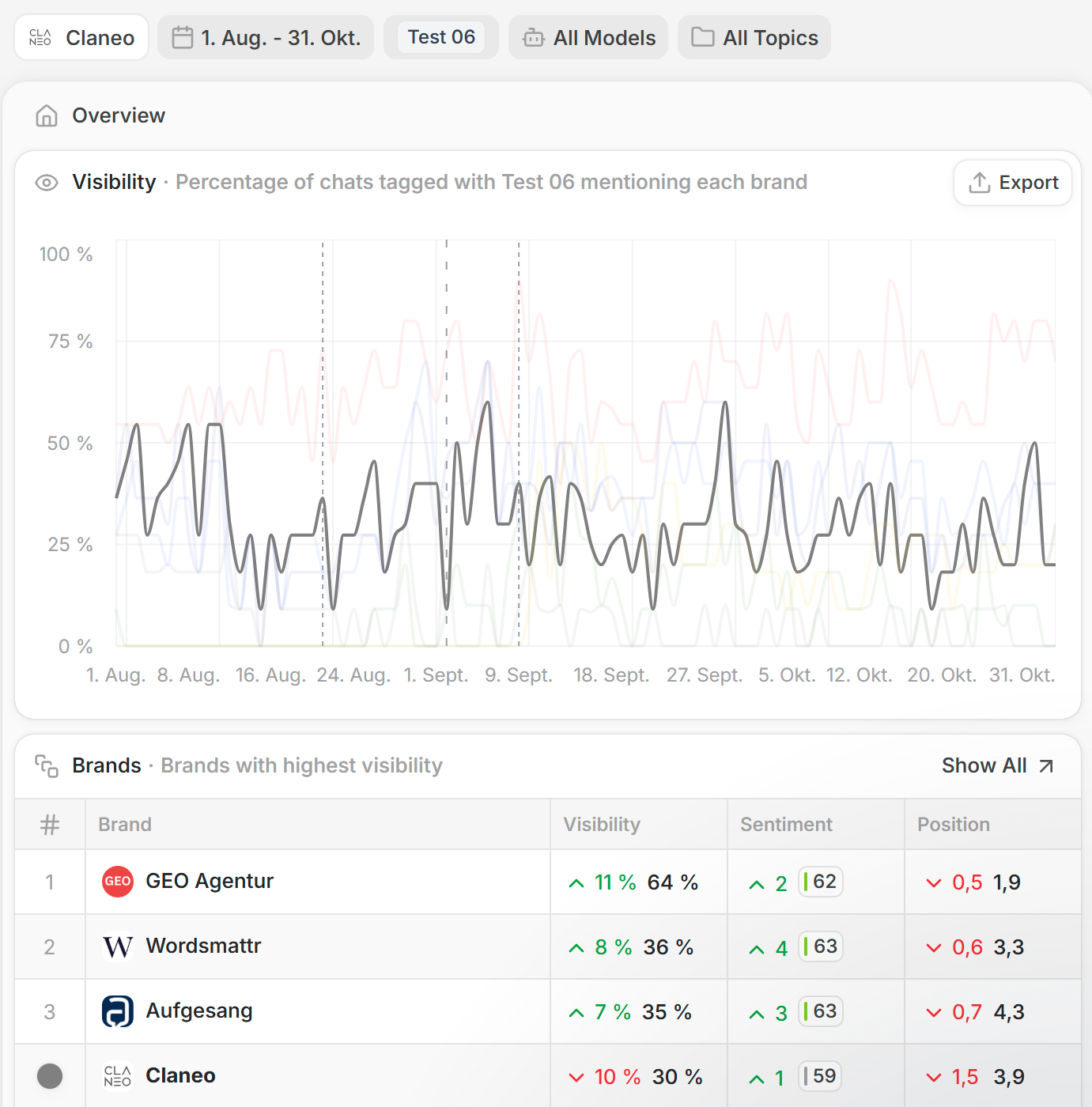 Ein Blick in unser Peek AI Dashboard bestätigt das ernüchternde Bild: Im Zeitraum vom 1. August bis 19. November liegt Claneo mit einer Visibility von 32% und einer durchschnittlichen Position von 4,0 deutlich hinter den Wettbewerbern.