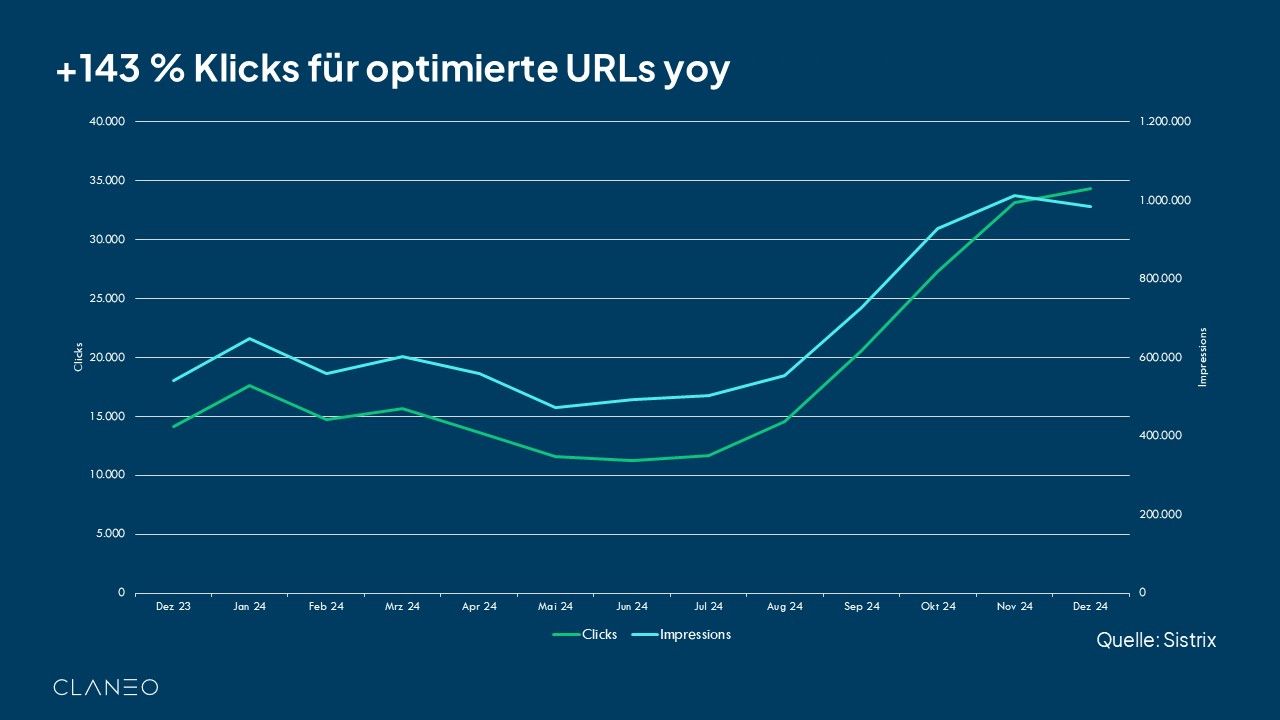 Wichtige Keywords erreichten bessere Rankings in den Suchergebnissen. Besonders erfreulich war der signifikante Traffic-Zuwachs von 143 % für die optimierten URLs, was die erhöhte Online-Präsenz von Buderus unterstreicht. Die gesamte Site verzeichnete einen Traffic-Zuwachs von 13 % im Year-over-Year-Vergleich (Dez. 2023 versus Dez. 2024).