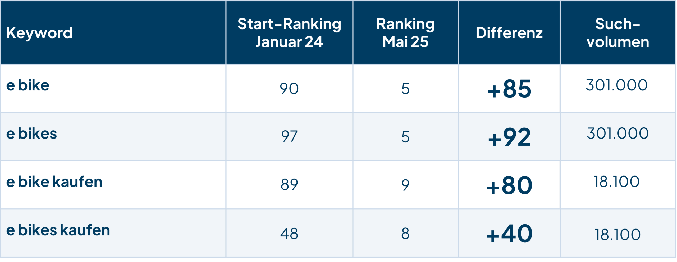 - Sukzessive Erweiterung auf generische Keywords: Aufbauend auf der gestärkten Nischen-Autorität wurde die Strategie schrittweise auf allgemeine, wettbewerbsintensive Keywords wie „E-Bike“ oder „E-Mountainbike“ ausgeweitet.