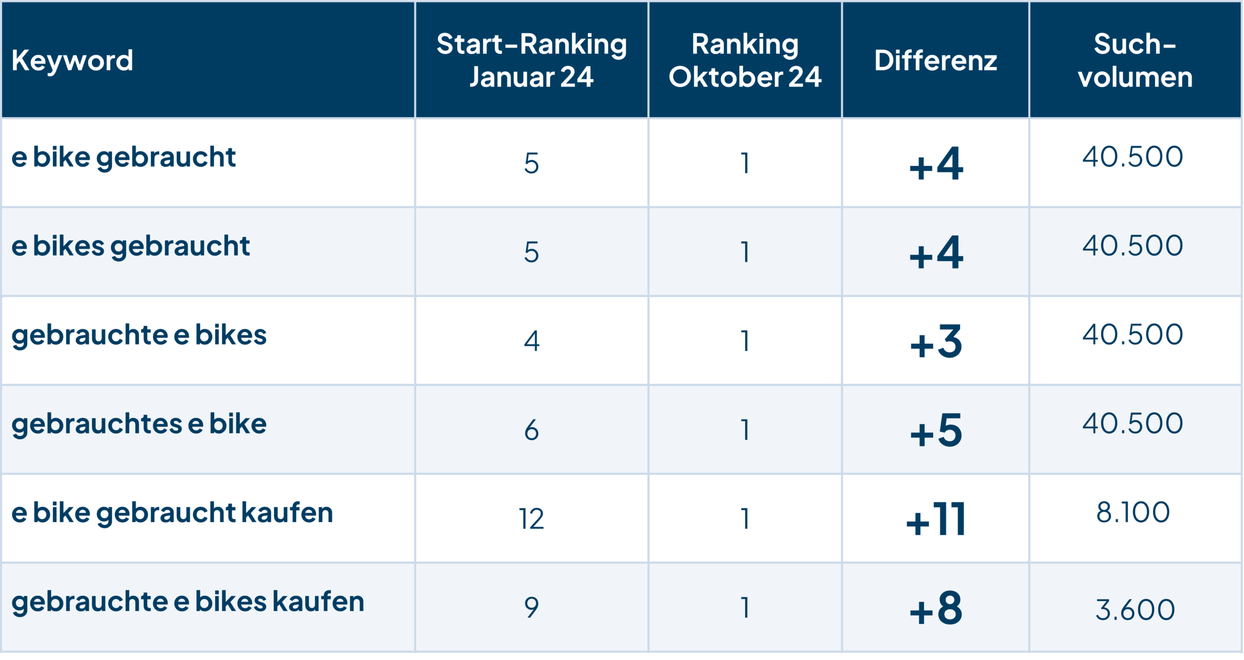 Die gezielte Content-Erstellung und -Optimierung führte bereits im ersten Jahr der Zusammenarbeit zu massiven Ranking-Sprüngen. Die Anzahl der Top-10-Keywords für Begriffe mit „gebraucht“ stieg bis Oktober 2024 um 27 %, die der allgemeinen Keywords sogar um 59 %. Bei den Top-3-Rankings konnte eine Steigerung von 85 % für allgemeine Begriffe erzielt werden.