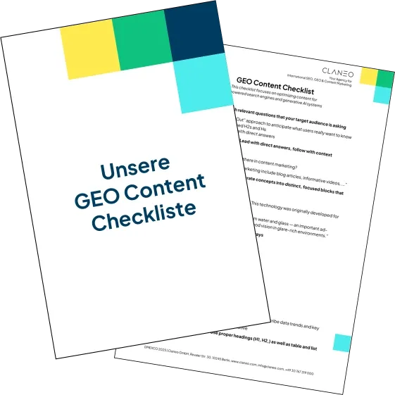 Die GEO Content Checkliste von Claneo unterstützt Sie dabei, alle wichtigen Aspekte der Generative Engine Optimization zu berücksichtigen. Von der richtigen Strukturierung Ihrer Inhalte über die Verwendung von Frage-Antwort-Formaten bis hin zur technischen HTML-Optimierung – mit dieser Checkliste stellen Sie sicher, dass kein Schritt übersehen wird, um Ihre Inhalte für die KI-Suche zu optimieren.
