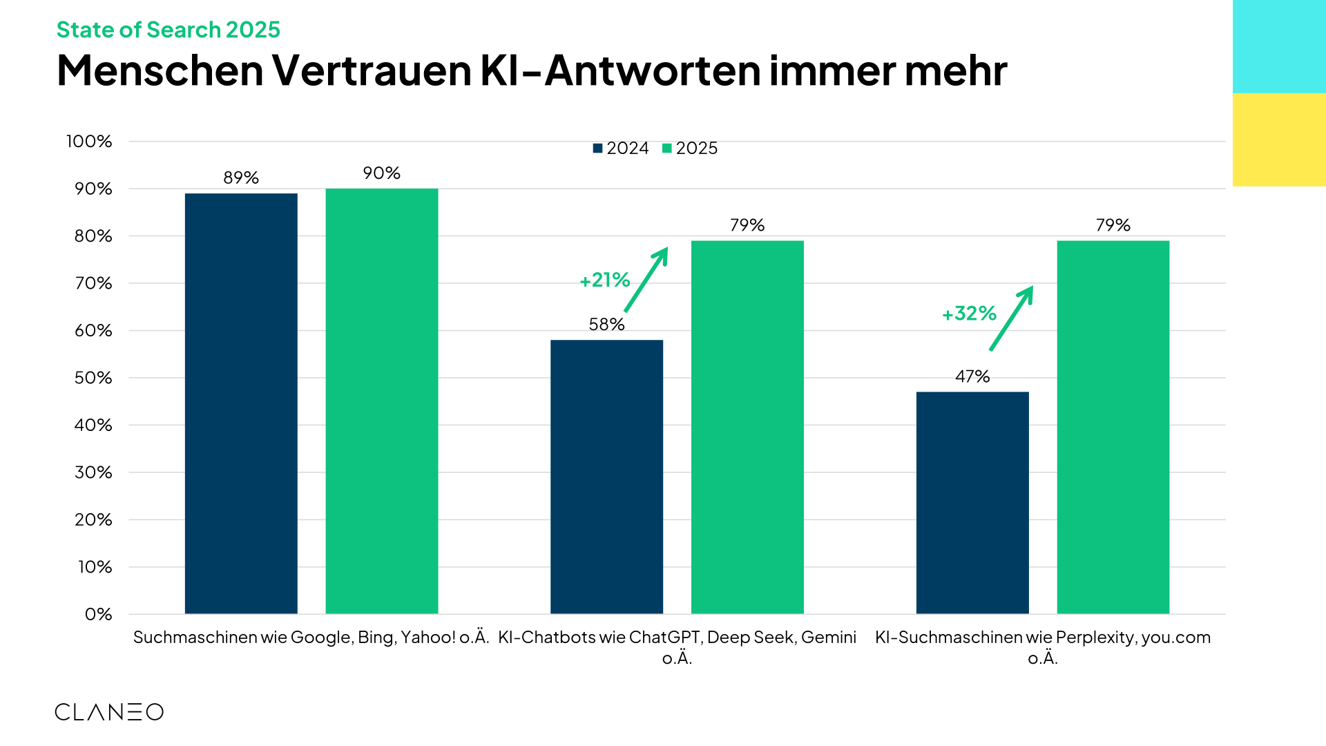 Das Vertrauen in KI-Antworten steigt kontinuierlich. Von 2024 auf 2025 zeigt sich ein deutlicher Trend: Menschen vertrauen KI-Systemen zunehmend als Informationsquelle.