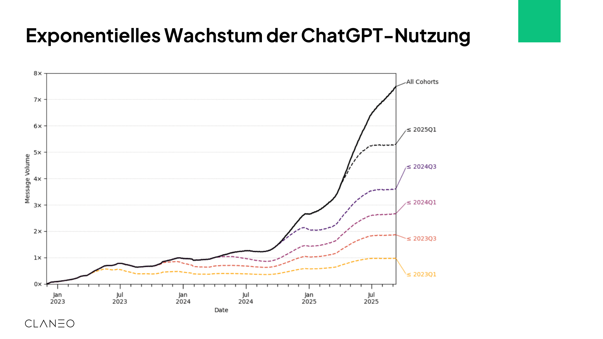 Die Nutzung von ChatGPT zeigt ein beeindruckendes Wachstumsmuster. Seit der Einführung im November 2022 steigt die Zahl aktiver Nutzer:innen exponentiell. Besonders bemerkenswert: Jede neue Kohorte startet auf einem höheren Niveau als die vorherige und bleibt aktiver.