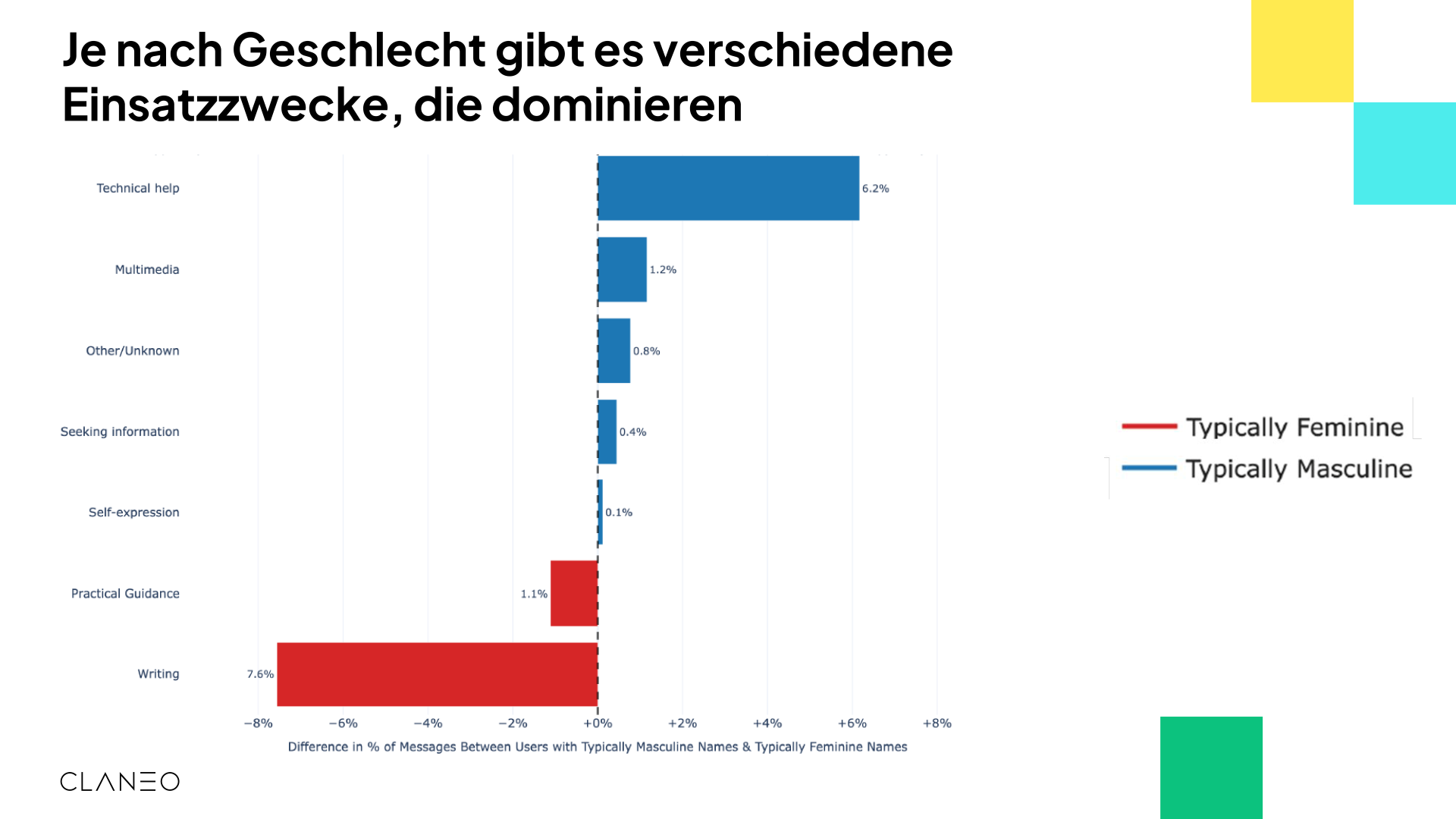 Die Analyse zeigt unterschiedliche Nutzungsschwerpunkte nach Geschlecht. Frauen nutzen ChatGPT stärker für kreative und kommunikative Aufgaben, Männer häufiger für technische und analytische Anwendungen.