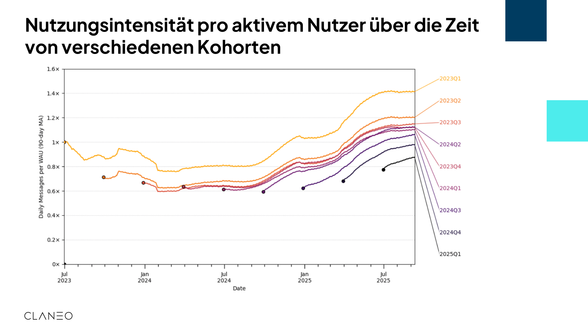 Frühe Nutzer:innen aus 2022/2023 zeigen konstant hohe Aktivität. Spätere Kohorten starten bereits auf einem höheren Nutzungsniveau – ein Zeichen für zunehmende Produktreife und gesellschaftliche Akzeptanz.