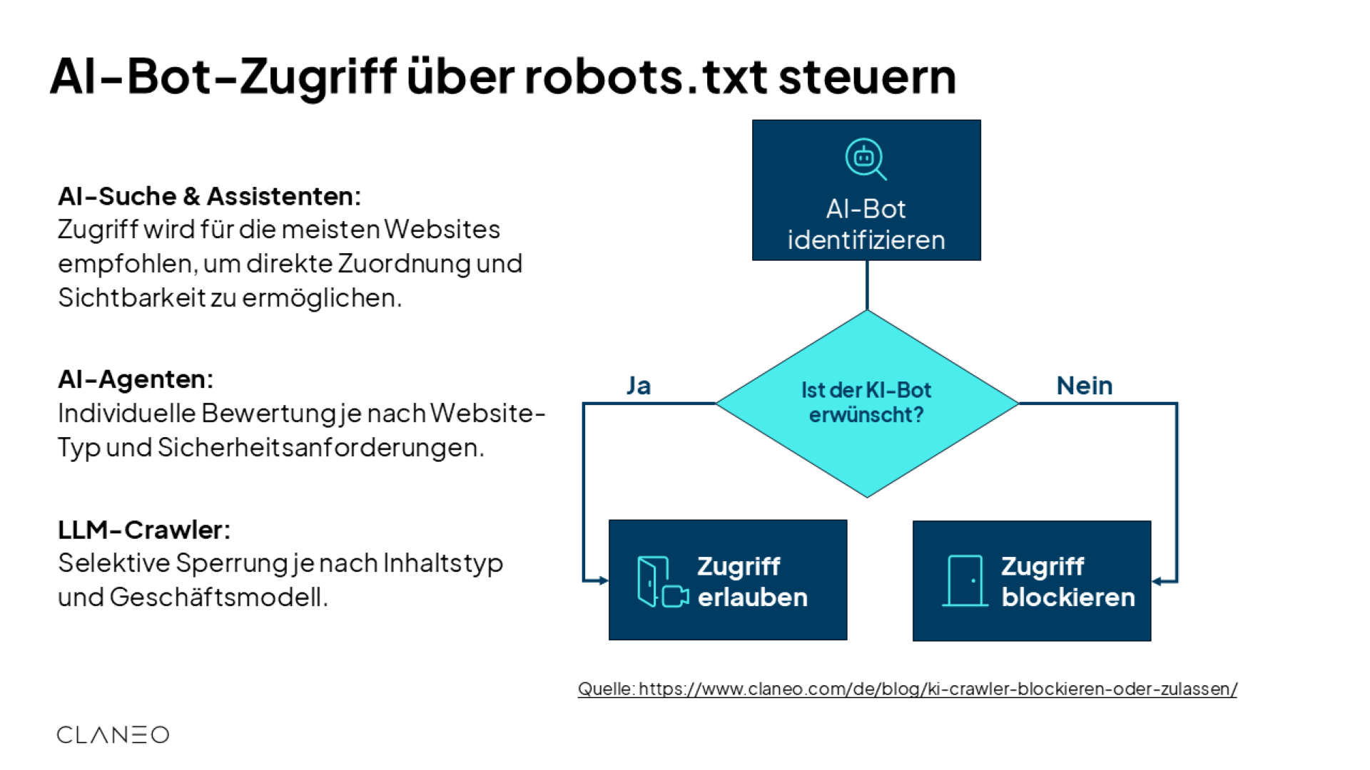 Strategische Entscheidungen über robots.txt und Firewall-Einstellungen treffen. Differenziert zwischen AI-Suche, Agenten und Training-Crawlern unterscheiden.