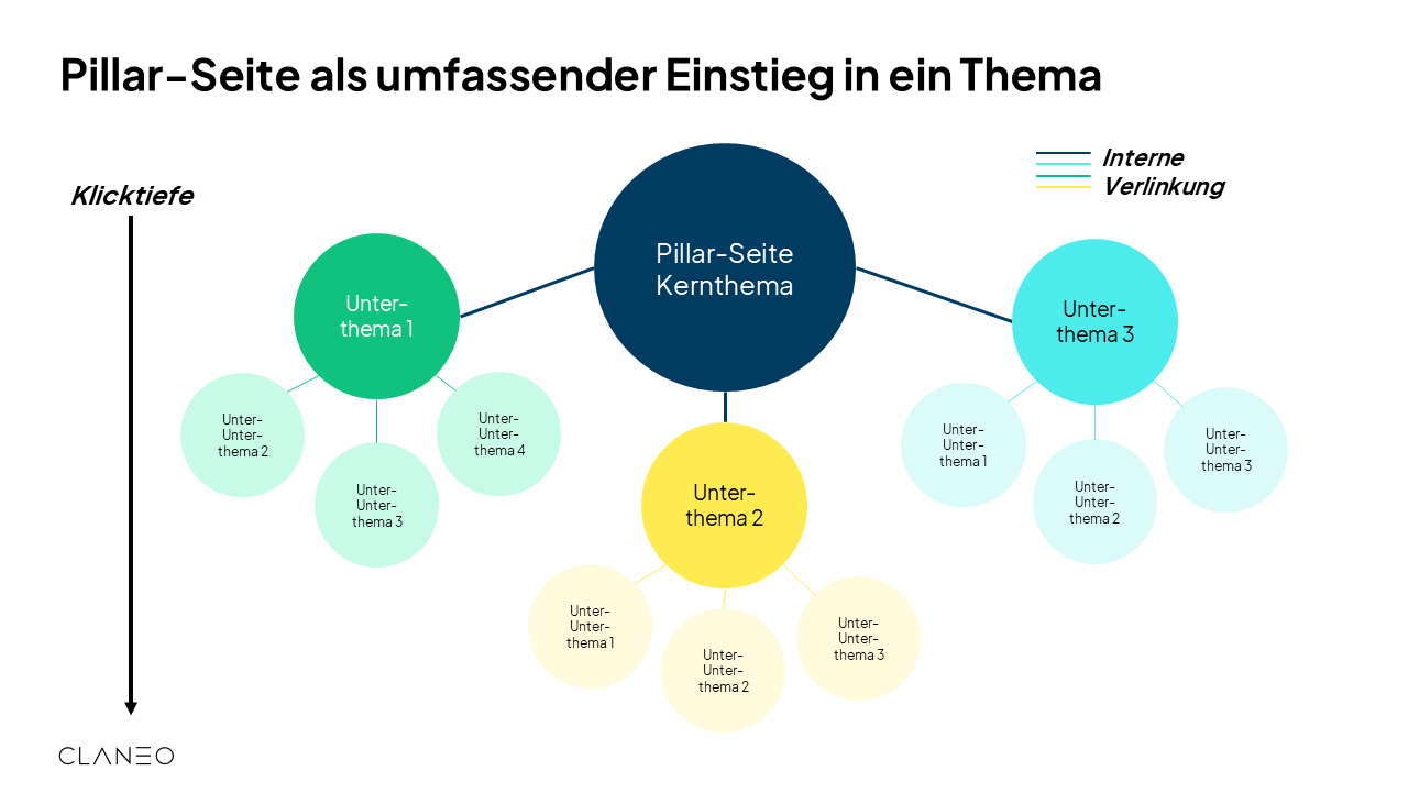 Ein bewährtes Konzept für die Strukturierung von Inhalten sind Pillar-Seiten. Dabei wird ein Kernthema auf einer zentralen Seite behandelt, von der aus zu spezifischeren Unterthemen verlinkt wird.
