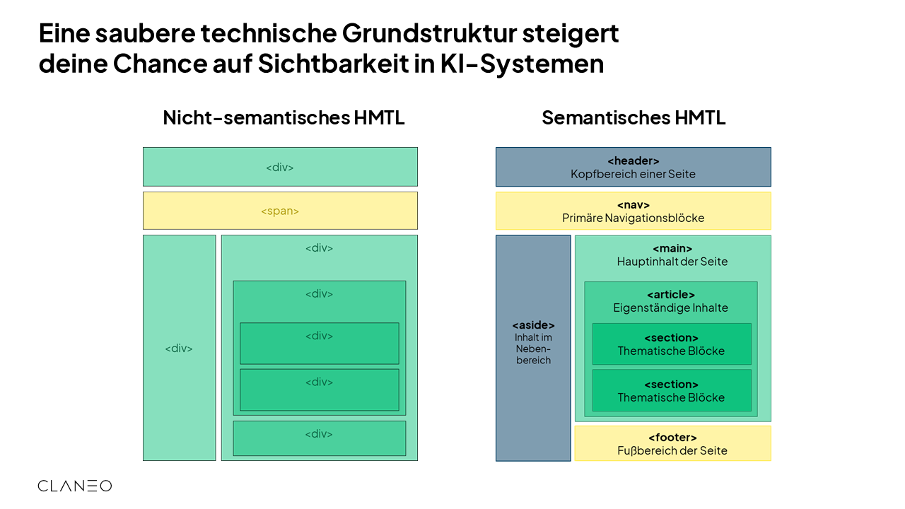 Tags wie <article>, <section>, <footer> oder <nav> strukturieren die Seite semantisch und helfen KI-Systemen, Haupt- von Nebeninhalten zu unterscheiden.