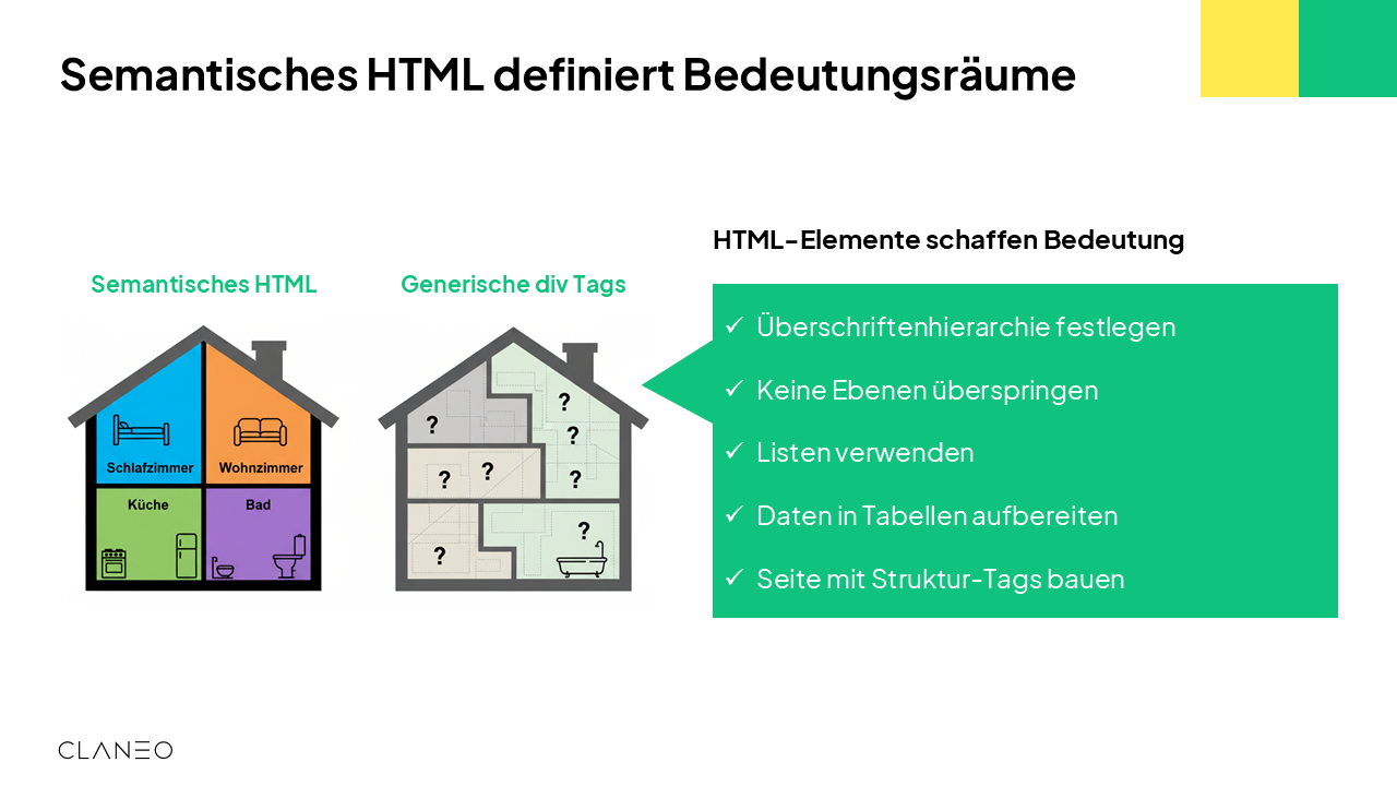 Ein Grundrissplan zeigt die Räume eines Hauses, aber nicht deren Funktion. Erst wenn man die Räume beschriftet (Küche, Bad, Schlafzimmer), wird klar, was wo ist. Semantisches HTML funktioniert genauso: Es gibt Kontext und macht Strukturen maschinenlesbar.