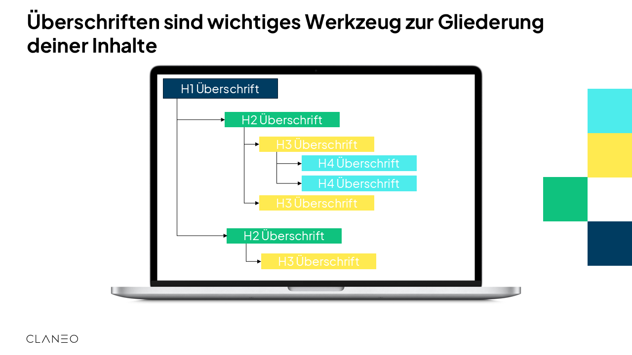 Überschriften (H1-H6) strukturieren Inhalte hierarchisch. KI-Systeme nutzen sie, um die Gliederung und Wichtigkeit von Abschnitten zu verstehen. Wichtig: Keine Ebenen überspringen.