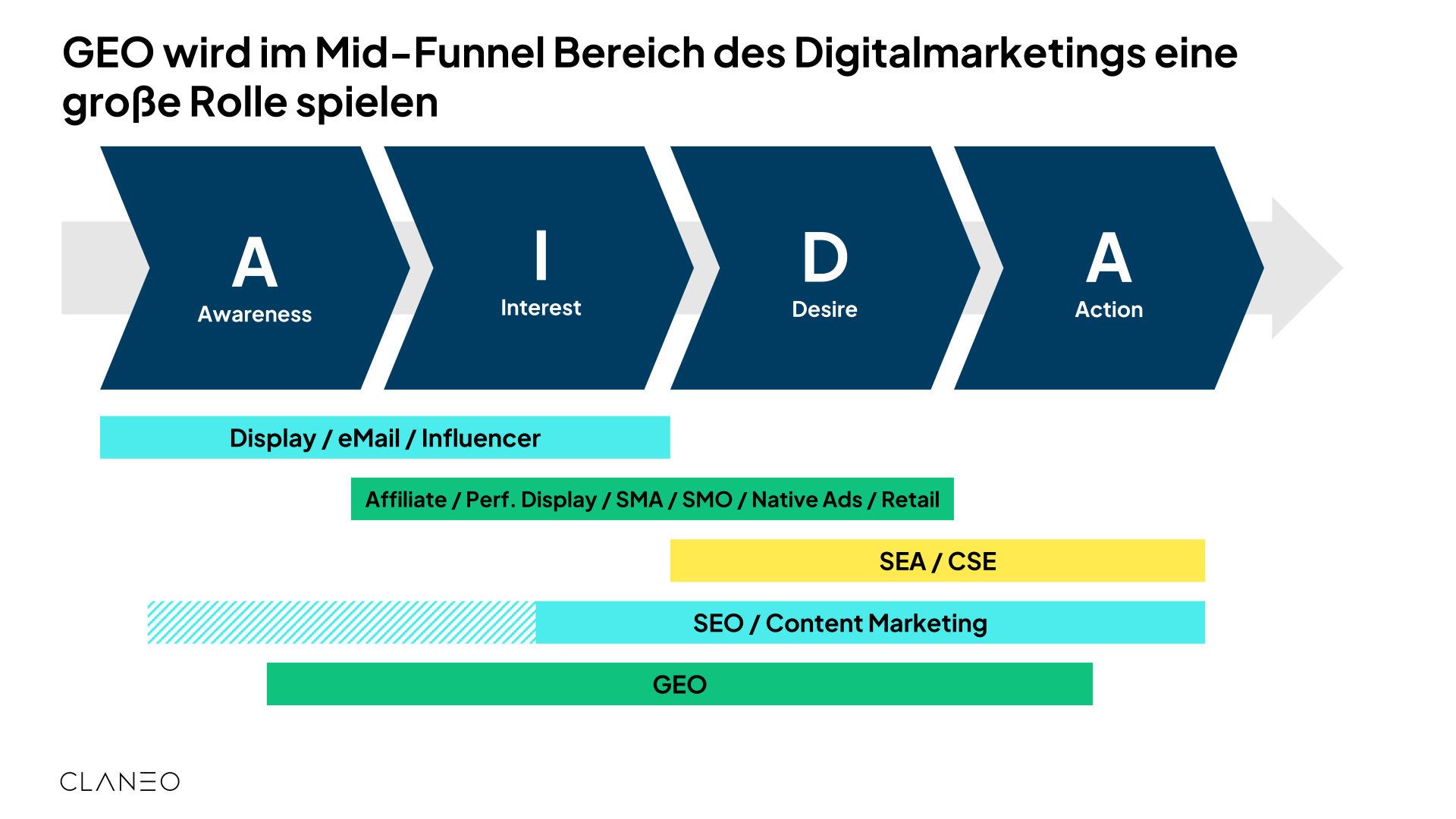 Betrachten wir den klassischen AIDA-Marketing-Funnel (Awareness, Interest, Desire, Action), so lässt sich GEO vor allem im Mid-Funnel verorten. Während SEO und Content-Marketing den gesamten Funnel abdecken, spielt GEO seine Stärken besonders in den Phasen „Interest“ und „Desire“ aus.