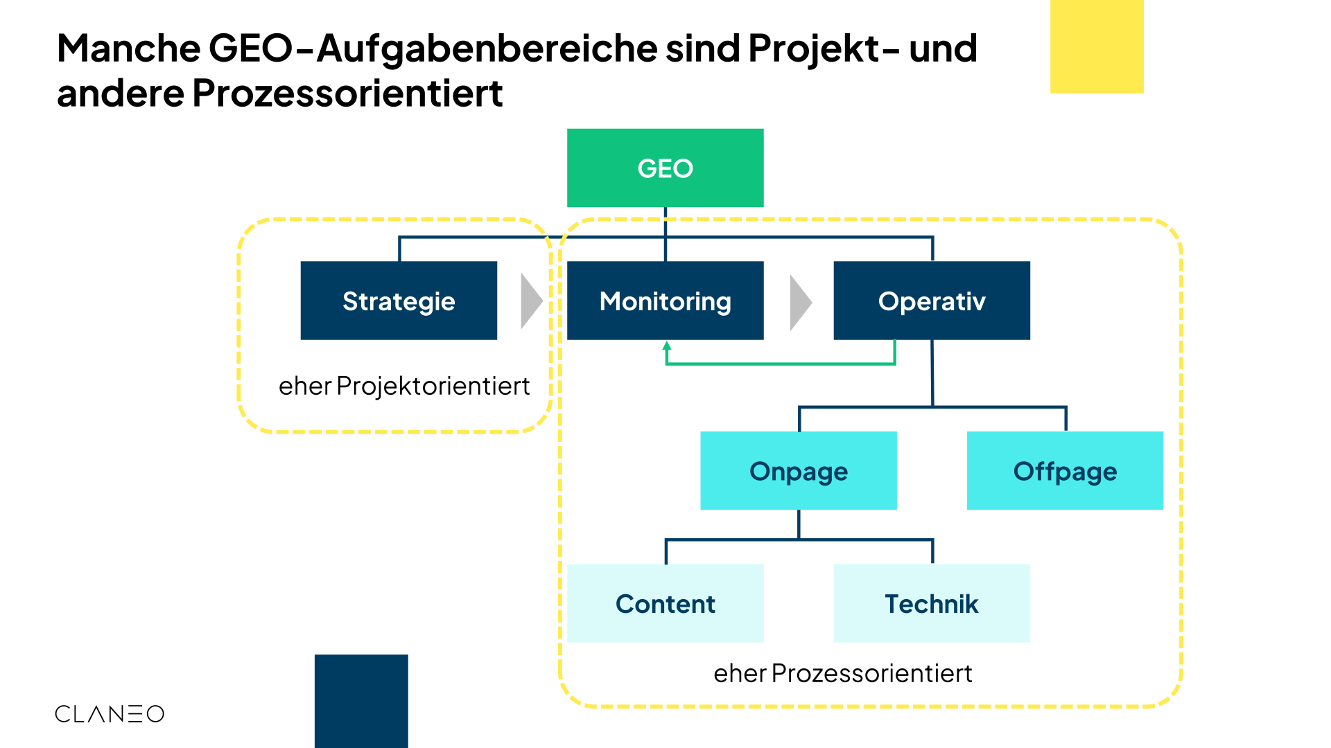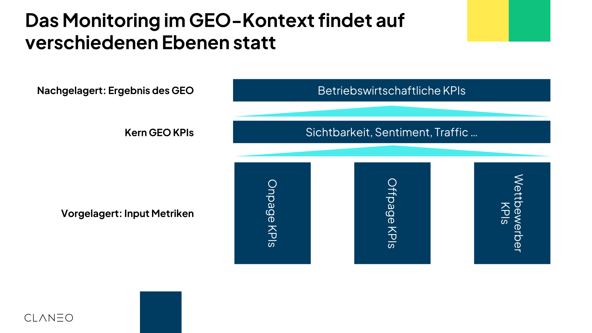 Das Monitoring im GEO-Kontext findet auf drei verschiedenen Ebenen statt, um sowohl den direkten Einfluss als auch den betriebswirtschaftlichen Wert der Maßnahmen zu verstehen: