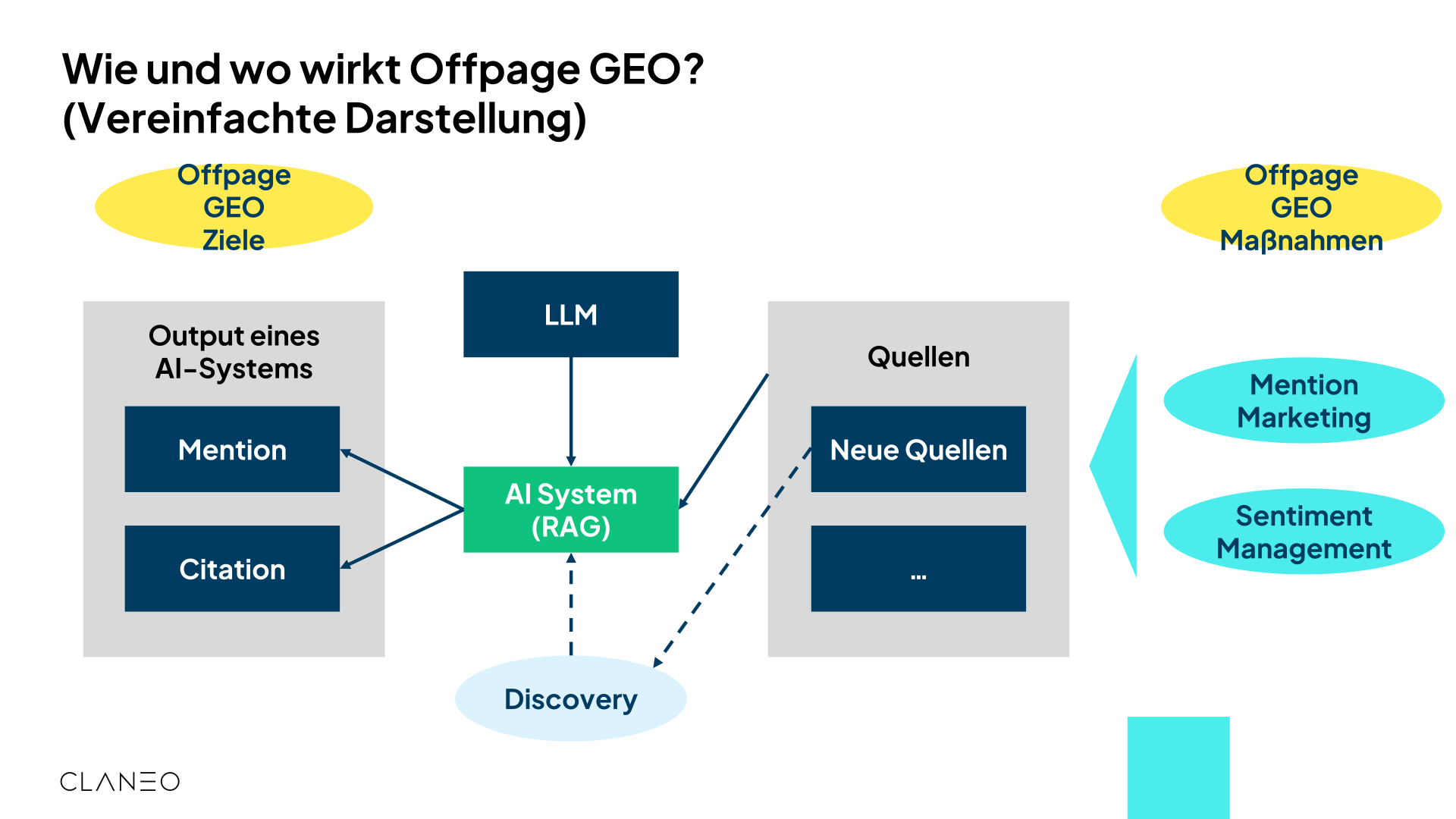 Maßnahmen wie „Mention Marketing“ oder „Sentiment Management“ beeinflussen externe Quellen (z.B. Fachartikel, Reviews). Diese Quellen werden von den AI-Systemen (via RAG) herangezogen, um Antworten zu generieren, was wiederum zu wertvollen Erwähnungen (Mentions) und Zitaten (Citations) führt.