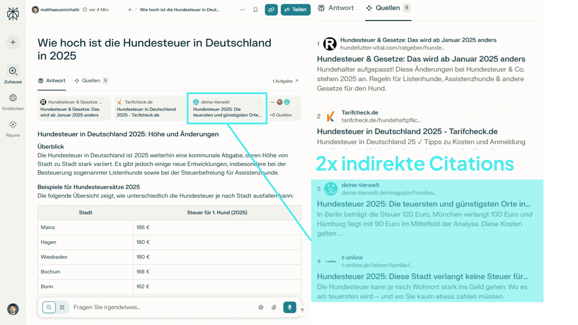 Perplexity bevorzugt in diesem Fall etablierte Autoritäten gegenüber der Original-Quelle. Das unterstreicht die Bedeutung von Digital PR: Selbst wenn deine eigene Website nicht direkt zitiert wird, sorgen die Presseberichte auf autoritativen Plattformen dafür, dass deine Inhalte und deine Marke im KI-Output erscheinen.