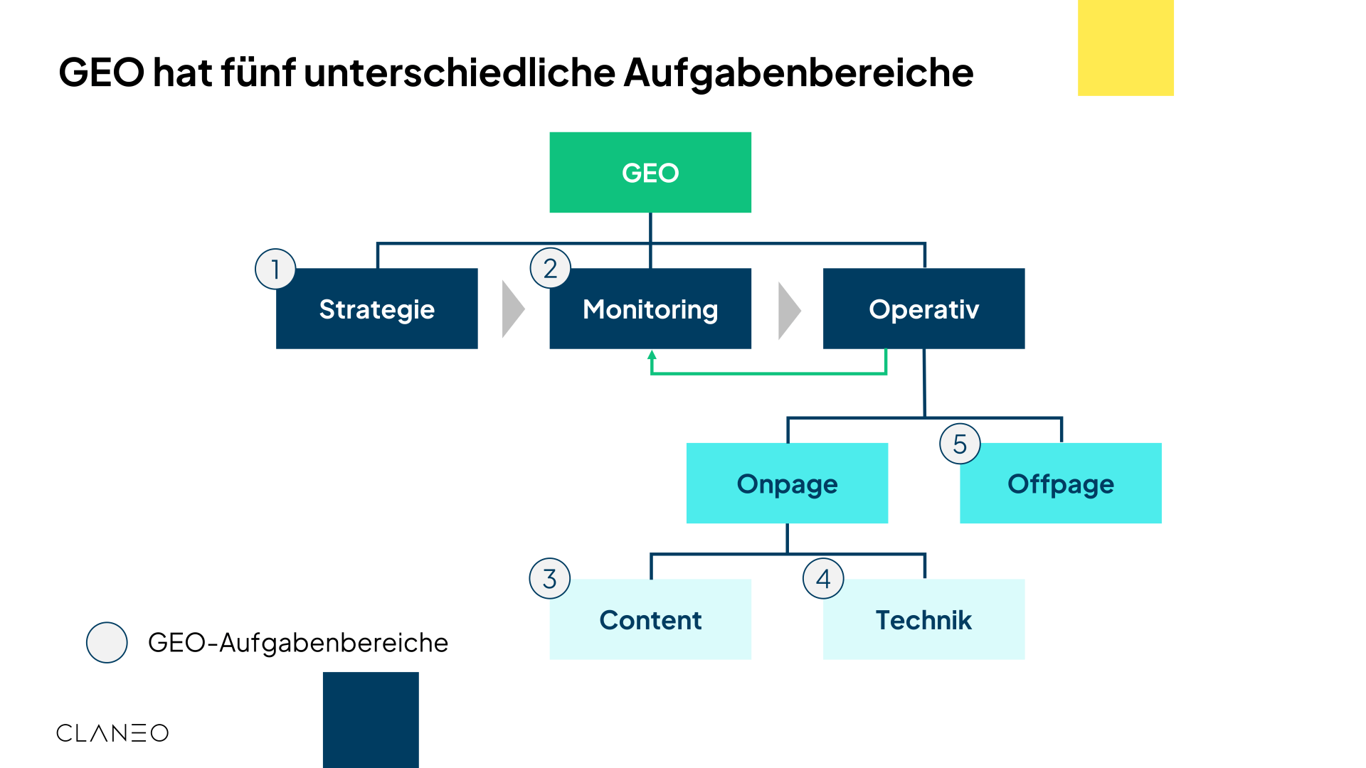GEO lässt sich in fünf Aufgabenbereiche gliedern: Strategie, Monitoring, Onpage Content, Onpage Technik und Offpage. Digital PR gehört zum Offpage-Bereich – du arbeitest also nicht an deiner eigenen Website, sondern schaffst auf fremden, autoritativen Plattformen Inhalte, die KI-Systeme als vertrauenswürdige Quellen wahrnehmen.