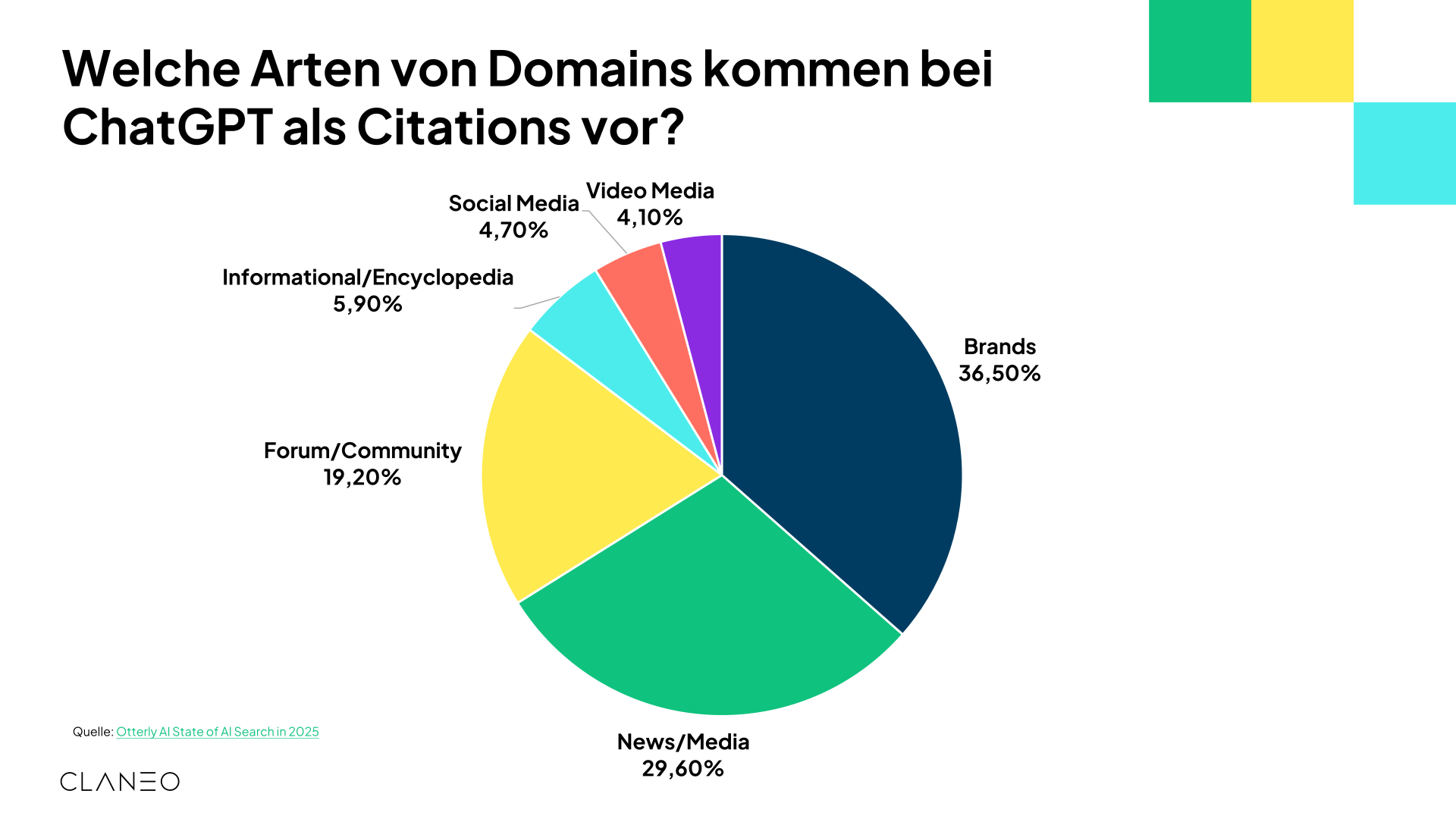 Nicht alle Websites sind für KI-Systeme gleich wertvoll. Eine Studie von Otterly AI (State of AI Search in 2025) zeigt: News & Media-Seiten machen 29,6% aller Citations bei ChatGPT aus – die zweitwichtigste Quelle nach Brand-Websites (36%).
