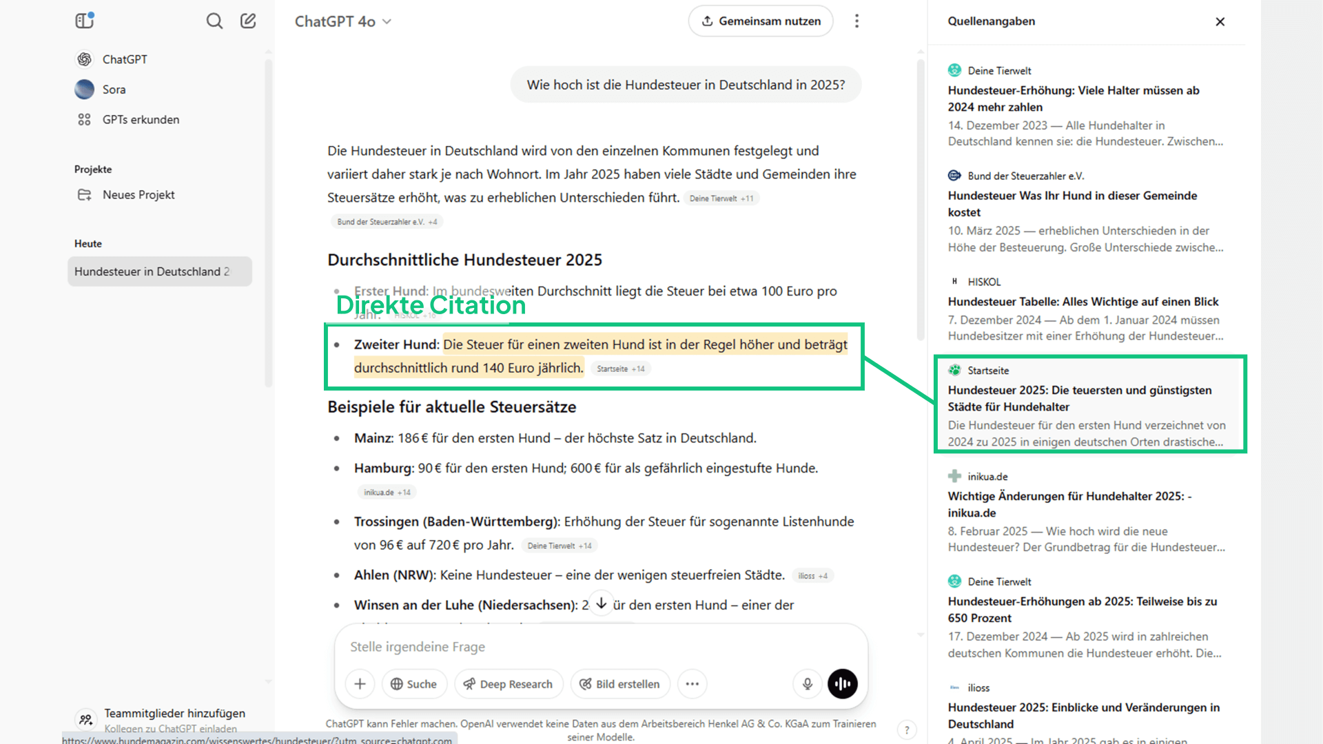 Bei Google zeigt sich eine beeindruckende Marktdurchdringung: Von insgesamt 5 Citations stammen alle entweder direkt von uns oder von Medien, die über unsere Kampagne berichteten. Das bedeutet: Wir dominieren das Thema „Hundesteuer 2025“ in den AI Overviews.