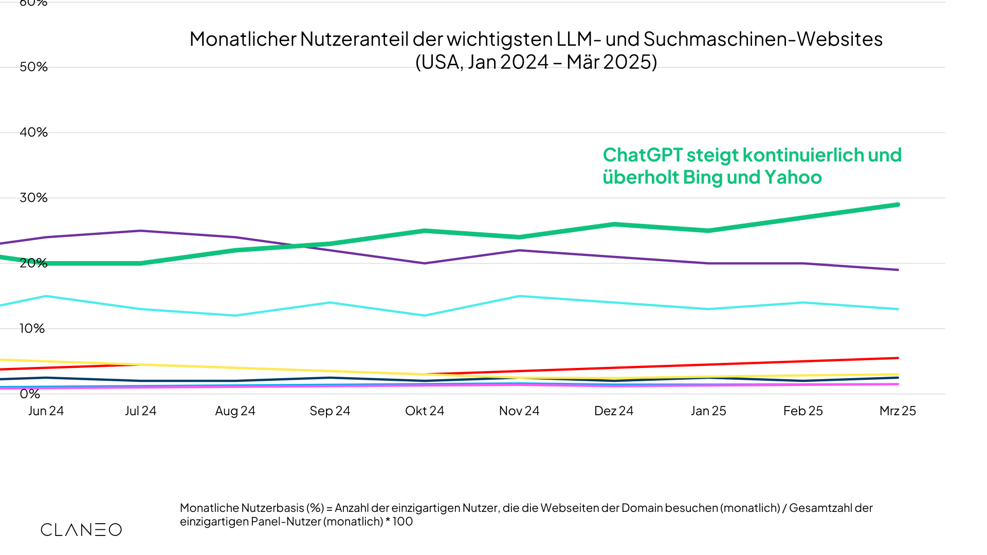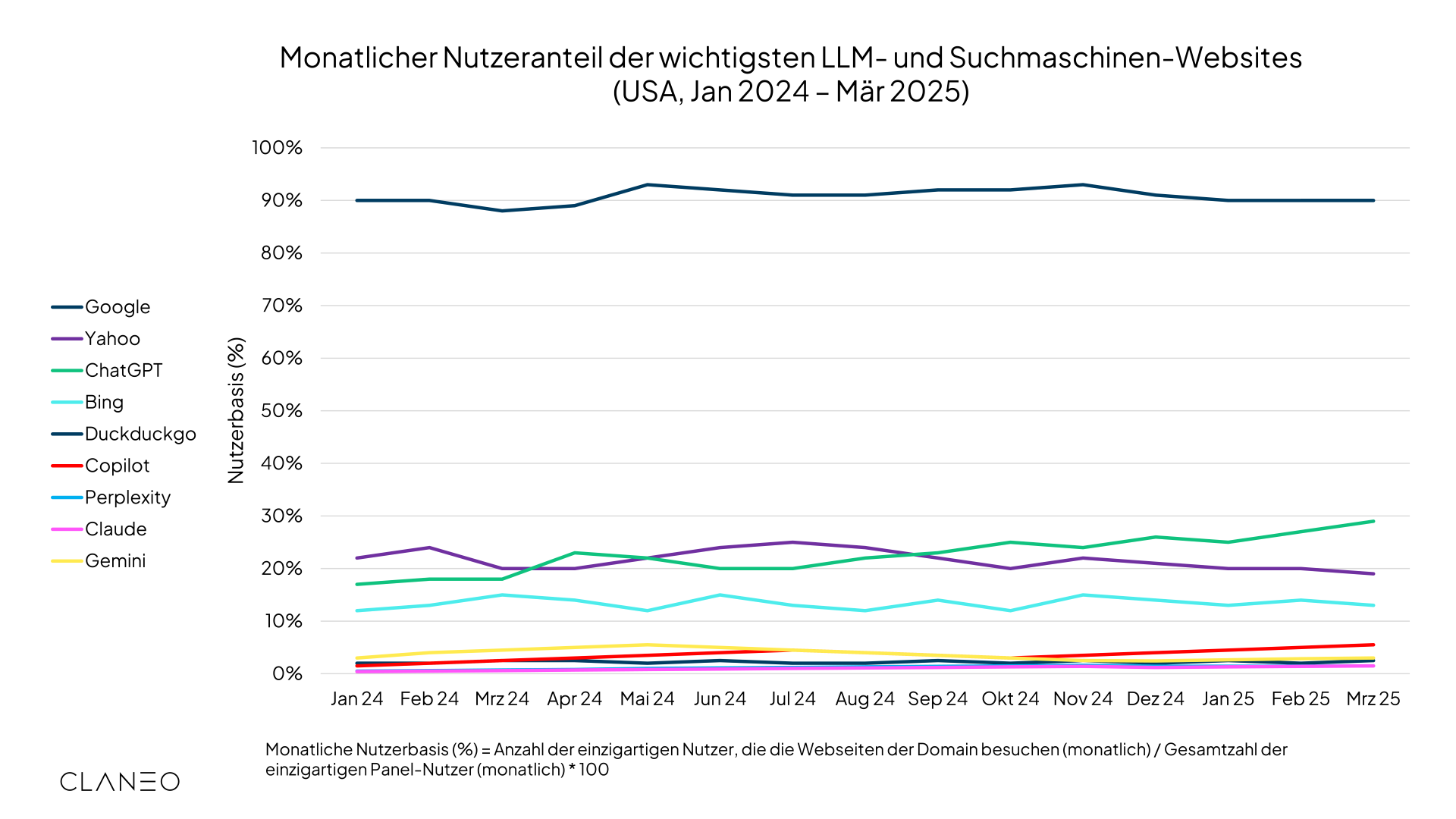 Google bleibt dominant und zeigt stabile Nutzungszahlen. Die jahrzehntelange Marktführerschaft spiegelt sich auch in der KI-Ära wider – keine Erosion erkennbar.