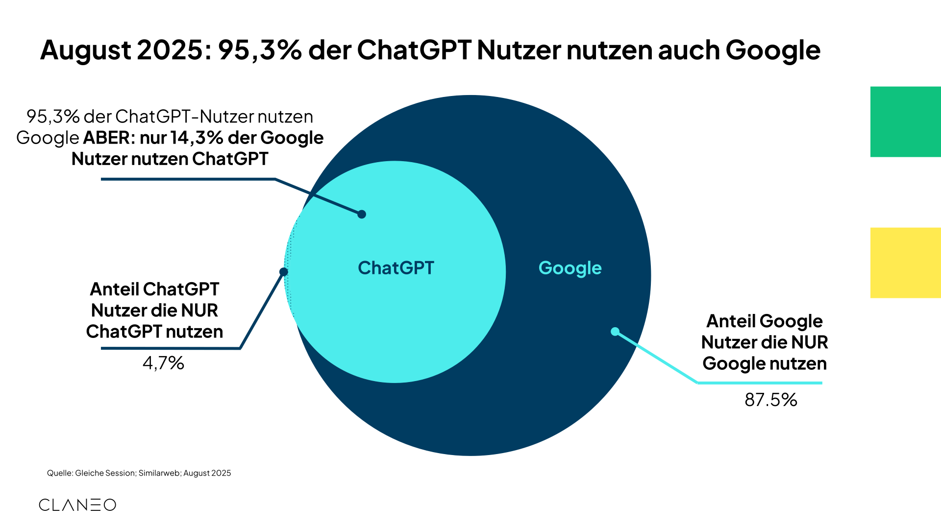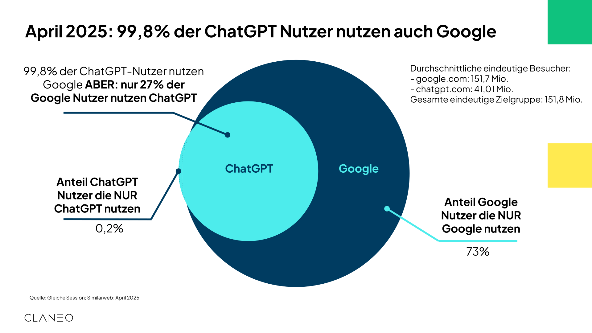 Im April 2025 nutzen 98,1% der ChatGPT-Nutzenden auch Google. Nur 0,2% nutzen ausschließlich ChatGPT. Umgekehrt nutzen 27% der Google-Nutzenden auch ChatGPT. 73% bleiben Google-exklusiv.