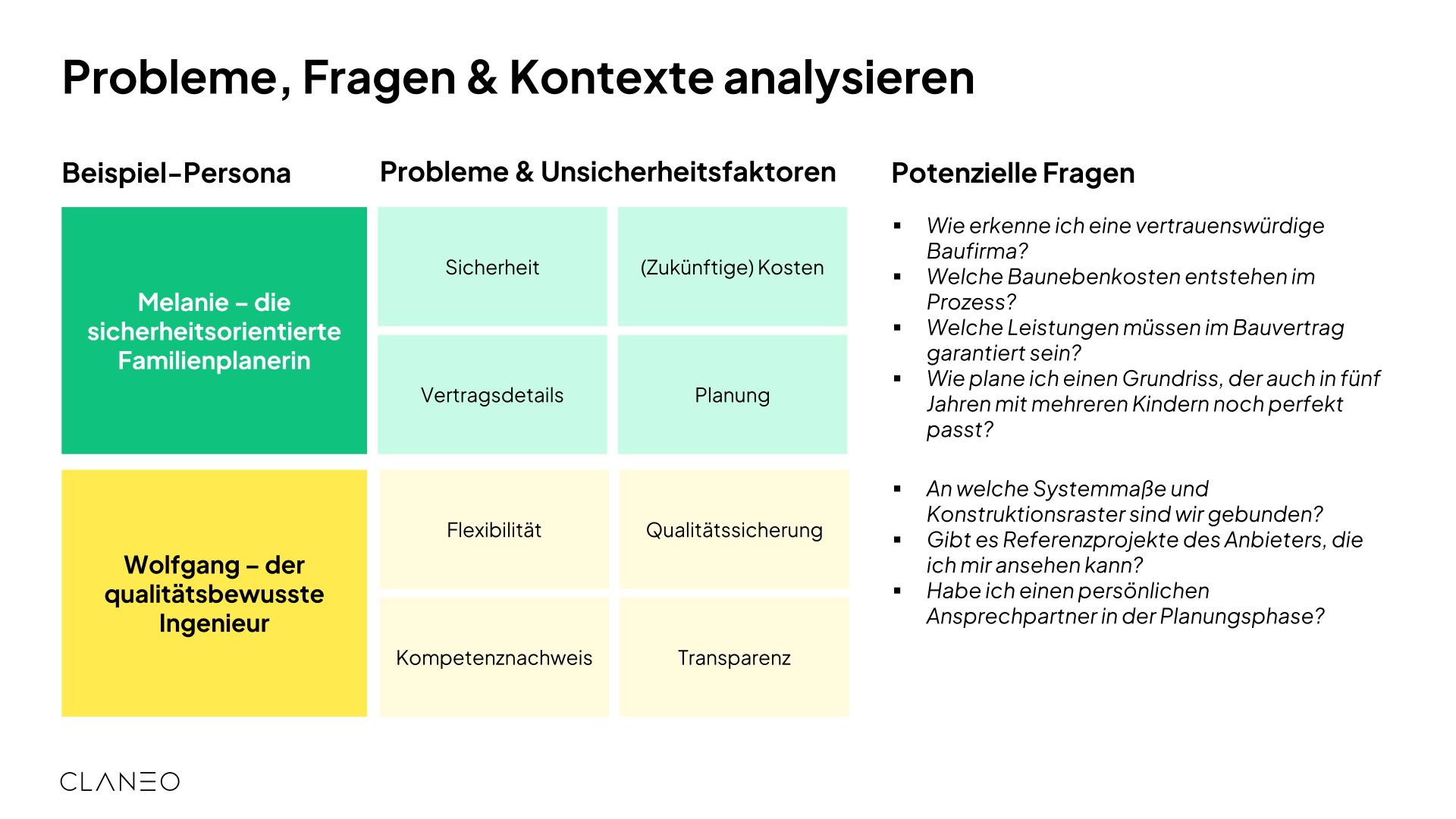 Die Analyse erfolgt systematisch für jede Persona und deckt emotionale, rationale und praktische Fragestellungen ab. Das Ergebnis ist eine strukturierte Übersicht aller relevanten Informationsbedürfnisse.