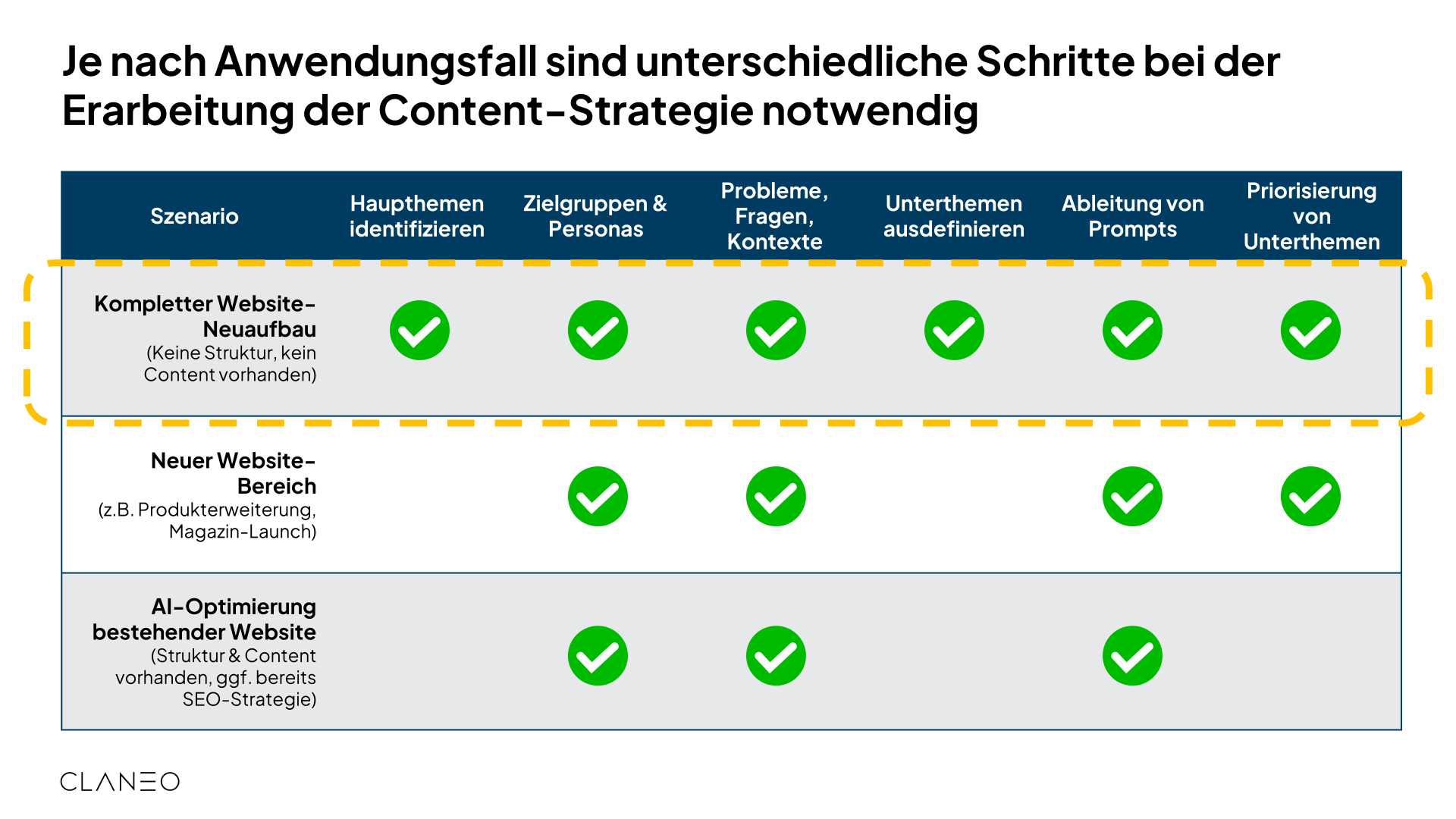 Bei einem kompletten Neuaufbau ohne bestehende Struktur oder Content sind alle sechs Schritte vollständig zu durchlaufen. Von der strategischen Themendefinition über die Zielgruppenanalyse bis zur Priorisierung wird die gesamte Content-Architektur neu entwickelt.