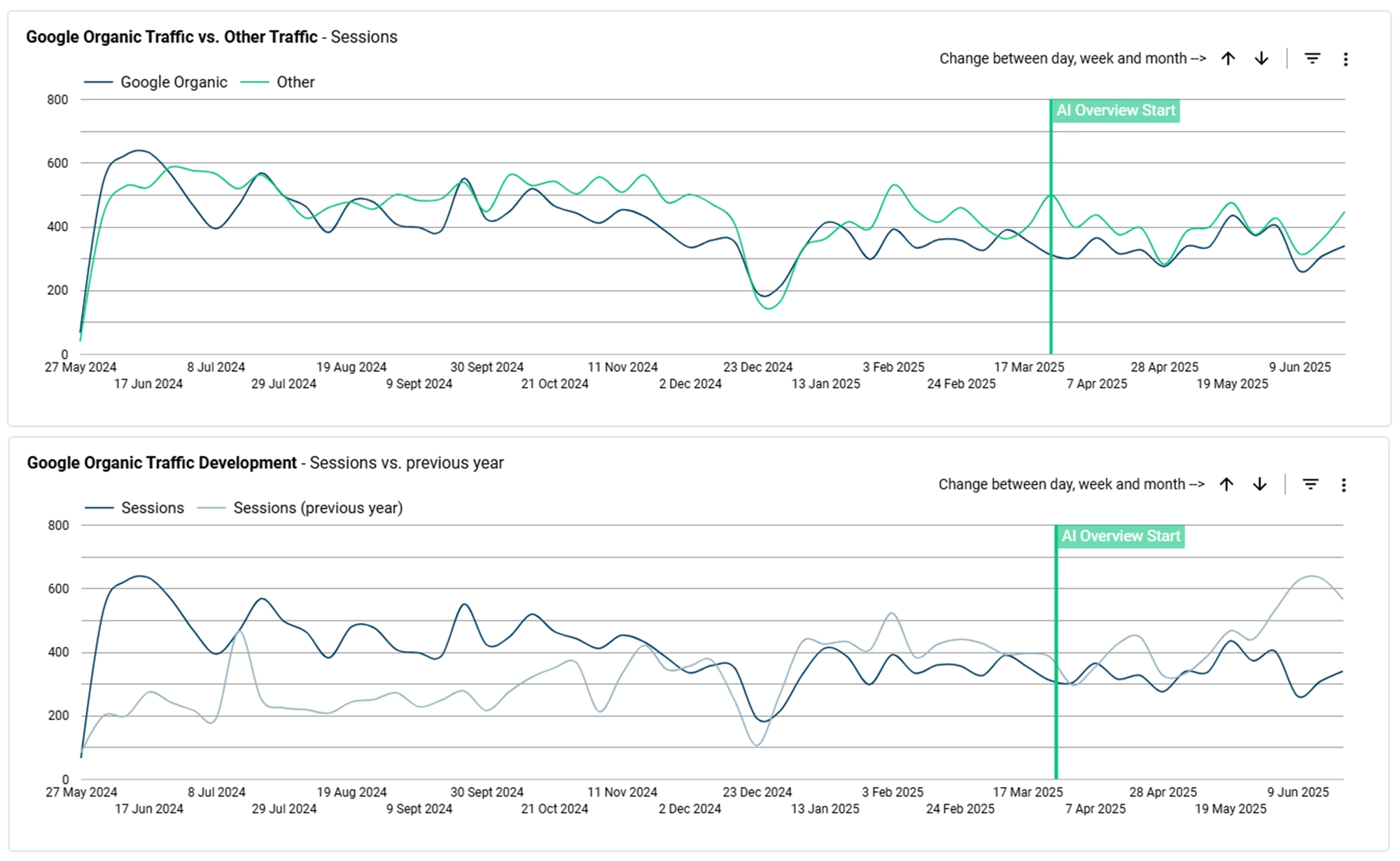 - Entwicklung seit AI Overviews: Beobachten Sie die Entwicklung Ihres organischen Google-Traffics seit der Einführung der AI Overviews, um mögliche Auswirkungen zu erkennen.