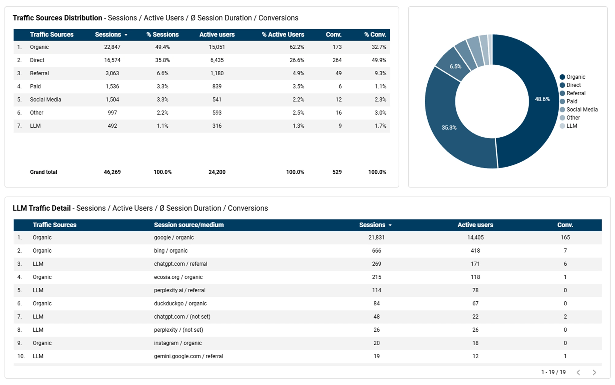 - Organischer Traffic vs. LLM-Traffic: Vergleichen Sie den LLM-Traffic mit Ihren anderen Traffic-Quellen, um die Relationen und Abhängigkeiten zu verstehen.