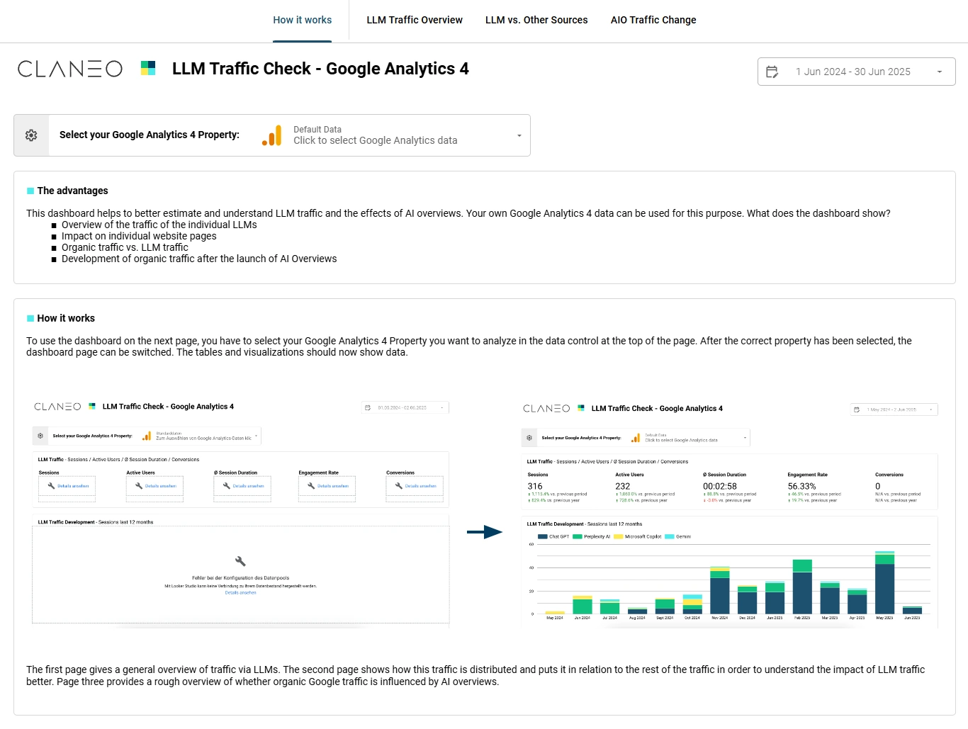 Dieses Dashboard hilft dabei, den Traffic von Large Language Models (LLMs) und die Effekte von KI-Overviews besser einzuschätzen und zu verstehen. Dafür können ganz einfach die eigenen Google Analytics 4 Daten angebunden werden.