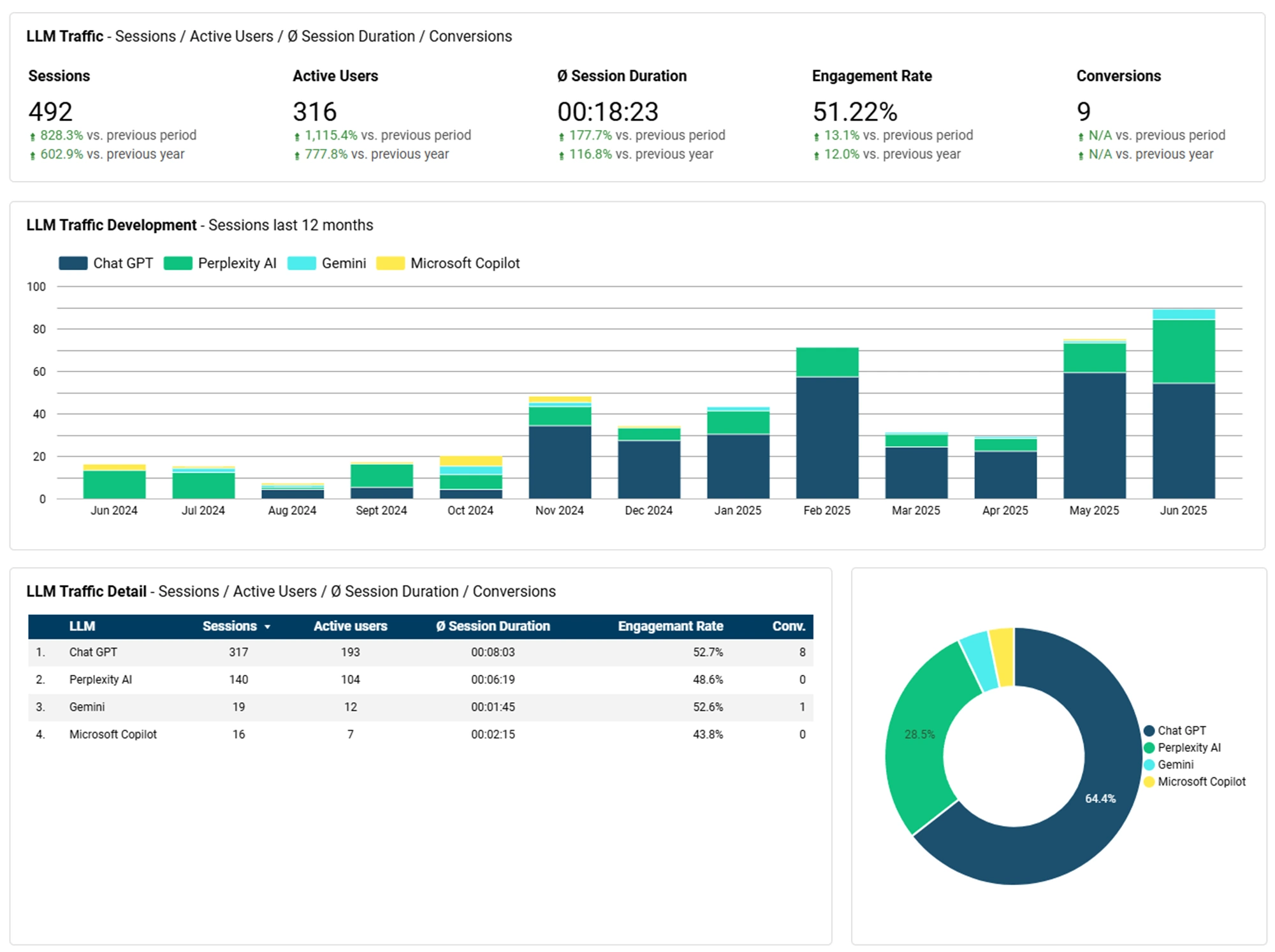 - Überblick über den Traffic der einzelnen LLMs: Sehen Sie auf einen Blick, wie viel Traffic von ChatGPT, Perplexity AI, Gemini und Microsoft Copilot kommt.
